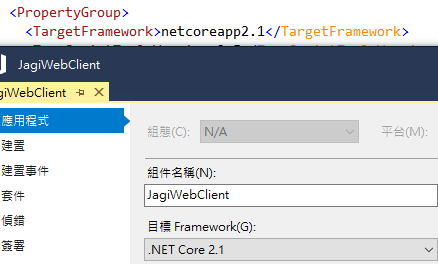 可以直接在專案屬性中變更,或者手動調整 TargetFramework 由 2.0 -> 2.1: